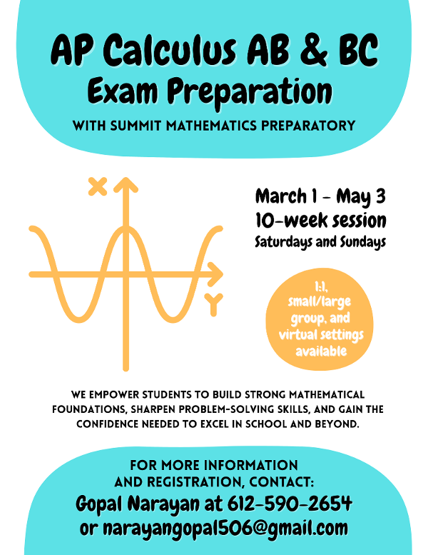 AP Calculus AB and BC classes will be offered from March 1 to May 3 (10-week program), taught by an experienced Mathematics Professor.