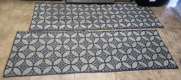Set of two rugs with beautiful pattern, anti skit, in a good condition. Perfect for kitchen, hall area, dining area entry area of house. Immediate move out sale.  Must go by Nov mid.